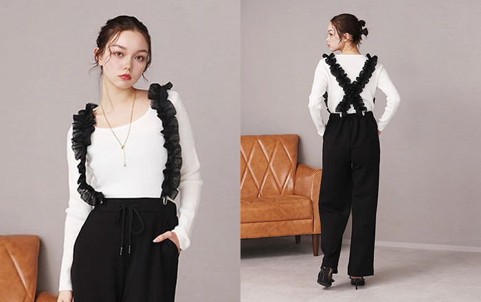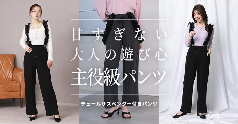 ひと癖あるチュールサスペンダーで、日常に遊び心を。視線を上に集めるチュールサスペンダーの縦のラインで、スタイルアップ。手持ちのアイテムが見違える、主役級パンツが可愛いだけじゃない洗練された美脚を叶えます。